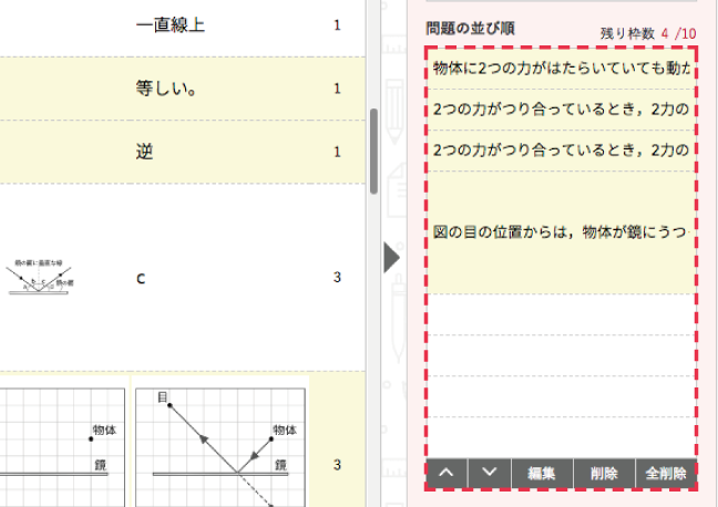 選ばれた問題は,画面右の問題プレビューに表示されます。 問題操作ボタンを押せば,問題順の並びかえや削除などを行うことができます。 |