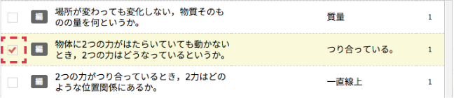 出題したい問題文の左にある選択欄をクリックしてください。 1回分のテストには,最大で10枠分の問題を入れることができます。 問題の枠数の合計が1〜10 になるように問題を選んでください。 |